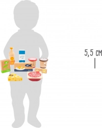 Zestaw zawiera sok pomarańczowy, dwa opakowania lodów, opakowanie groszku, paluszki rybne, masło, ser, krojoną wędlinę oraz karton mleka. Realistyczne nadruki i naturalny wygląd przyciągają uwagę od pierwszego spojrzenia. Dzięki solidnemu drewnu zestaw jest trwały i gotowy na codzienną zabawę.