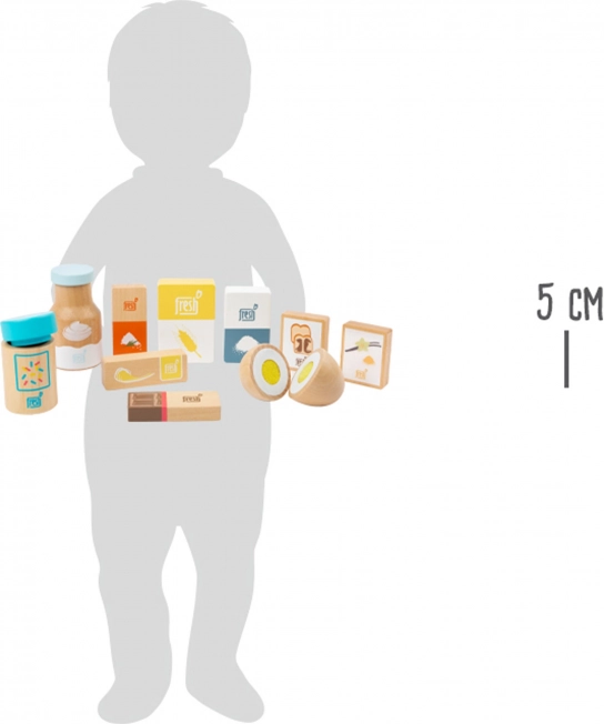 Rozwijaj wyobraźnię małych piekarzy dzięki tej 10‑elementowej drewnianej sadzie dodatków od small foot. Zawiera wszystko, co potrzebne do zabawy w pieczenie: mąkę, cukier, śmietanę, sól, proszek do pieczenia, cukier waniliowy oraz rozkładane jajko. Świetnie uzupełnia dziecięcą kuchnię, wspiera zabawę w odgrywanie ról i rozwój małej motoryki.