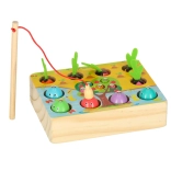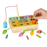 Zabawna drewniana gra Montessori, dzięki której dzieci mogą bawić się w „wędkowanie” i ogrodnictwo w domu. Za pomocą magnetycznej wędki łowią rybki i robaczki, a marchewki wyciągają za filcowe listki. Rozwija małą motorykę, koordynację ręka–oko, cierpliwość i precyzję, uczy kolorów oraz wrażliwości dotykowej. Wykonana z wysokiej jakości drewna z bezpieczną, nietoksyczną farbą.