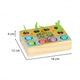 Wybierzcie się z dzieckiem na wyprawę nad staw i do ogródka – bez wychodzenia z domu. Drewniana baza skrywa otwory na rybki, robaczki i kolorowe marchewki. Dzieci łowią je magnetyczną wędką lub wyciągają za filcowe listki, dzięki czemu naturalnie trenują chwyt i czucie w palcach.