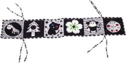Dzięki praktycznym sznurkom książeczkę można łatwo przymocować do łóżeczka lub wózka, co umożliwia łatwe używanie w domu i na drogach.