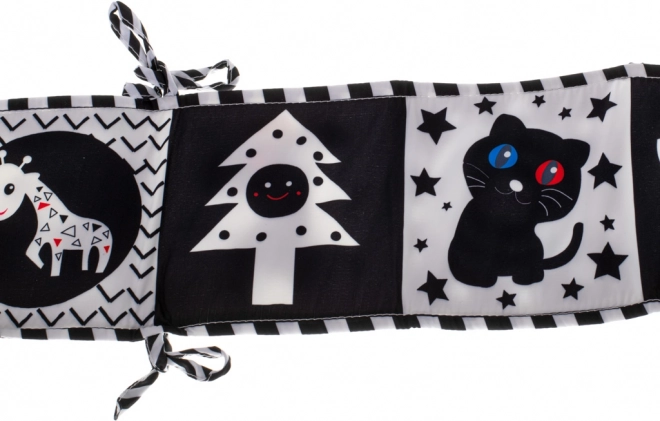 Kontrastowa książeczka sensoryczno-motoryczna, zaprojektowana jako ochraniacz do łóżeczka, jest doskonałym wyborem dla dzieci, które zaczynają odkrywać świat. Książeczka w formie harmonijki może być łatwo przymocowana do łóżeczka za pomocą sznurków, co zapewnia nie tylko zabawę, ale i bezpieczeństwo.