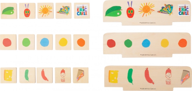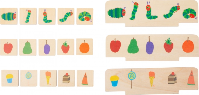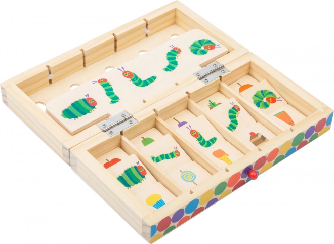 Design z lubianym motywem Very Hungry Caterpillar natychmiast przyciąga uwagę dzieci. Płytki i pokrywkę łatwo się obsługuje, a wytrzymałe drewniane wykonanie gwarantuje długą żywotność. Po zabawie wszystko po prostu zamykasz elastyczną taśmą – nic się nie rozsypie.