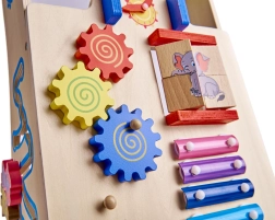 Na przedniej stronie znajduje się tablica pełna interaktywnych elementów rozwijających zmysły dziecka, w tym zegar, koła zębate i cymbałki.