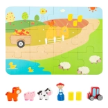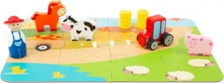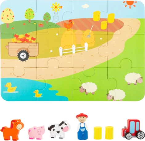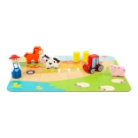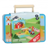 Świnka kwiczy, traktor buczy. Przenośna gra w pięknej walizeczce, dzieci mogą stworzyć własną farmę dzięki drewnianym figurkom w kształcie traktora, zwierząt domowych i farmera. Najpierw ułóż podstawę z puzzli, a potem możesz zacząć się bawić! Figurki bel siana dopełniają farmę. Zanurz się w wiejskim życiu i puść wodze fantazji. Walizeczka wykonana jest z wytrzymałego metalu, uchwyt z drewna, zamek można łatwo otworzyć. Odpowiednia do pokojów dziecięcych, bawialni... Główne cechy: zawiera 12 szt. puzzli oraz figurki farmera, traktora, świnki, krówki, konika i bele siana; praktyczne opakowanie – metalowa walizeczka z drewnianym uchwytem