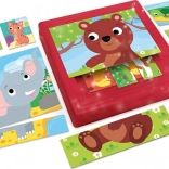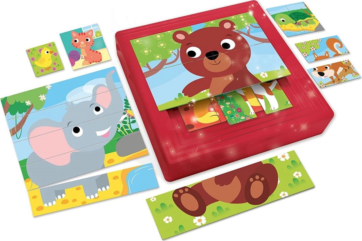 Progresywne puzzle maluchy 8 w 1 LISCIANI zachwycają pięknymi ilustracjami i sprytnym systemem układania. Zestaw zawiera kwadratowe plastikowe pudełko z dziewięcioma poziomami ramek, dzięki którym dzieci układają obrazki krok po kroku, od najłatwiejszego do najtrudniejszego. Elementy są proste, bez klasycznych zamków puzzli, co ułatwia manipulację nawet najmłodszym dzieciom.