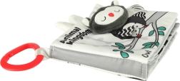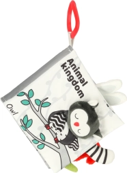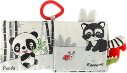 Z tą miękką książeczką w kontrastowych barwach Twoje dziecko wyruszy na odkrywanie świata zwierząt – od sowy przez małpkę i pandę po szopa, słonia, krokodyla czy zebrę. Czarno-białe i czerwone elementy wspierają wczesną stymulację wzrokową, a różne faktury oraz interaktywne elementy rozwijają małą motorykę i koordynację oko–ręka. Każda strona zawiera angielskie nazwy zwierząt, co w naturalny sposób wspiera pierwsze poznawanie słów.