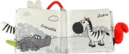 Każde przewrócenie strony przynosi nowe doświadczenie: szeleszczące materiały, wszyta grzechotka i piszczałka rozwijają słuch i motywują do ściskania oraz chwytania.