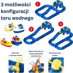 Zestaw składa się łatwo – uszczelnienie nie wymaga klejenia, więc szybko przechodzisz do zabawy. Wytrzymały materiał jest odporny na wodę i nadaje się do użytku na zewnątrz. Zestaw jest kompatybilny z LEGO DUPLO, więc możesz rozszerzać scenariusze zabawy i tworzyć własne wodne światy. Możliwość zbudowania 3 różnych konfiguracji toru przynosi wciąż nowe wyzwania i pomysły.