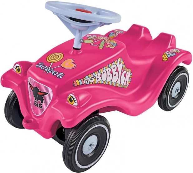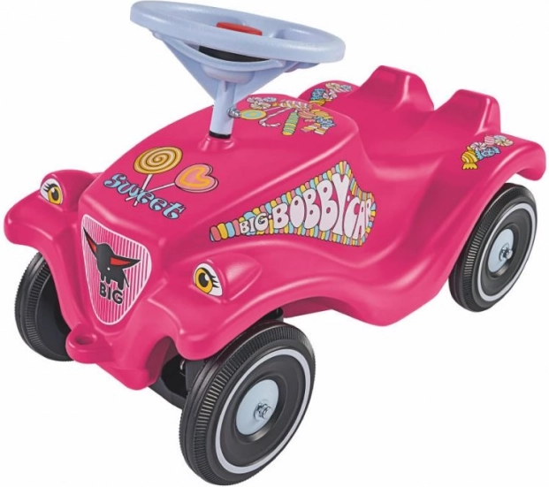 Popularny jeździk BIG Bobby Car Classic w różowej wersji z uroczymi naklejkami z motywem słodyczy to świetny wybór na pierwsze doświadczenia z jazdą. Dzięki ergonomicznemu siedzisku i stabilnej konstrukcji wspiera prawidłową postawę ciała oraz rozwój motoryki.