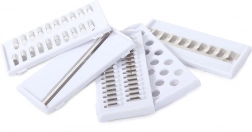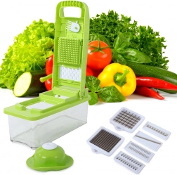 Praktyczna krajalnica i tarka to idealny pomocnik do każdej kuchni. Błyskawicznie pokroi owoce, warzywa, gotowane jajka i ser na kostkę, plastry i słupki, a dodatkowo wykonuje faliste cięcia. Dzięki przezroczystemu pojemnikowi z pokrywką o pojemności 1,5 l możesz przechowywać przygotowane składniki bezpośrednio w lodówce. Ostrza ze stali nierdzewnej są bardzo ostre i zapewniają czyste cięcie bez miażdżenia produktów.
