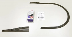 Zestaw torów z detaliczną reprodukcją drewnianych podkładów na żwirowym podłożu, autentyczne kolory, równoległy łuk i dwie zwrotnice. Idealny do budowy samodzielnie zasilanego owalu.
