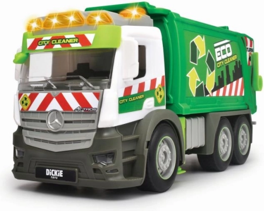 Odkryjcie sprzątanie miasta ze stylową śmieciarką Mercedes. Dzieci pokochają realistyczne wykonanie z funkcjonalnymi światłami i dźwiękami, które potęgują wrażenia z zabawy. Wywrotna skrzynia i dołączony kontener pozwalają załadować i wysypać „odpady” jak w rzeczywistości.