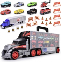 Ogromna ciężarówka–walizka łączy funkcję pudełka do przechowywania i zestawu do zabawy w jednym. Otwierane przegródki mieszczą cały zestaw pojazdów i akcesoriów, a praktyczny uchwyt ułatwia przenoszenie. Ręczny mechanizm startowy w kabinie zmienia ciężarówkę w tor wyścigowy i zapewnia dynamiczne starty.