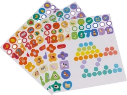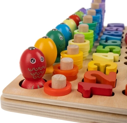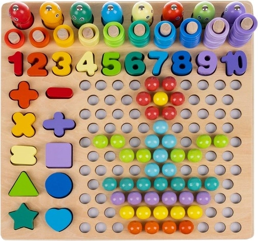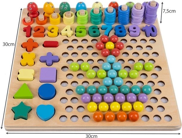 Zestaw zawiera dwustronne wzory, cyfry, symbole matematyczne oraz kolorowe kółeczka i kuleczki do budowania kompozycji. Dzięki drewnianej podstawie zabawka jest trwała i stabilna, a żywe kolory motywują do kreatywności, co ułatwia przyswajanie podstaw matematyki.