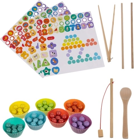 Kolorowe kuleczki, kółeczka i magnetyczne rybki zapewniają długotrwałe, wciągające aktywności. Dzieci układają wzory, łowią rybki i odkrywają nowe kombinacje.