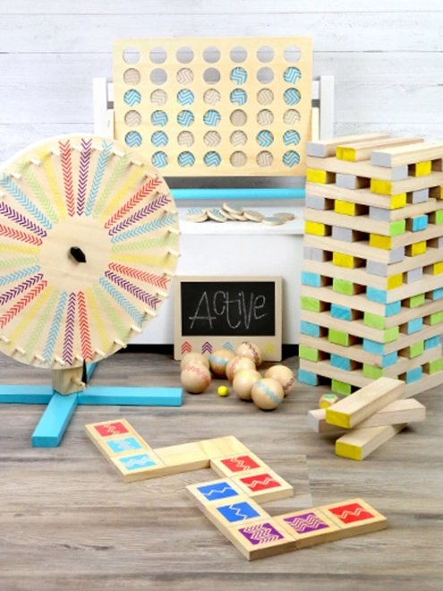 Domino XXL Active od small foot to ponadczasowa gra towarzyska w maxi wydaniu, która bawi dzieci i dorosłych. Każdy element wykonano w 100% z certyfikowanego drewna FSC i ozdobiono wyrazistymi kolorami oraz kreskowanymi wzorami. Grać można według kolorów lub wzorów – dzieci trenują rozróżnianie wizualne, koncentrację i myślenie strategiczne.