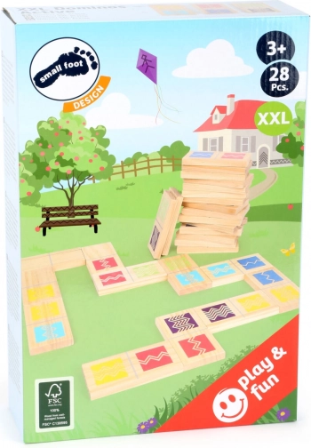 Ciesz się wielką porcją zabawy z dominem XXL wykonanym z wysokiej jakości drewna FSC. Zestaw 28 elementów oferuje grę na dopasowywanie kolorów i wzorów, rozwija małą motorykę, logikę i percepcję barw. Elementy są duże, solidne i bezpieczne dla dzieci od 3 lat. Idealne do zabawy w domu i na zewnątrz. Certyfikacja FSC, 28 ekstra dużych elementów, kolorowe i kreskowane wzory, odpowiednie dla najmłodszych.