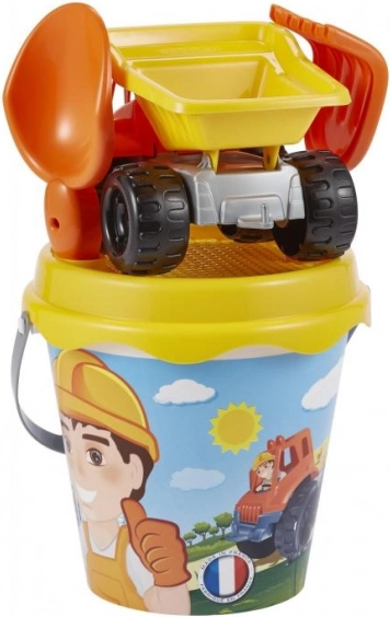 Zabawny zestaw do piasku dla małych budowniczych zawiera wiaderko, sito, ciężarówkę, grabki i łopatkę. Idealny na plac zabaw i plażę, o średnicy wiaderka 17 cm i wysokości 18 cm.