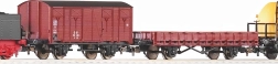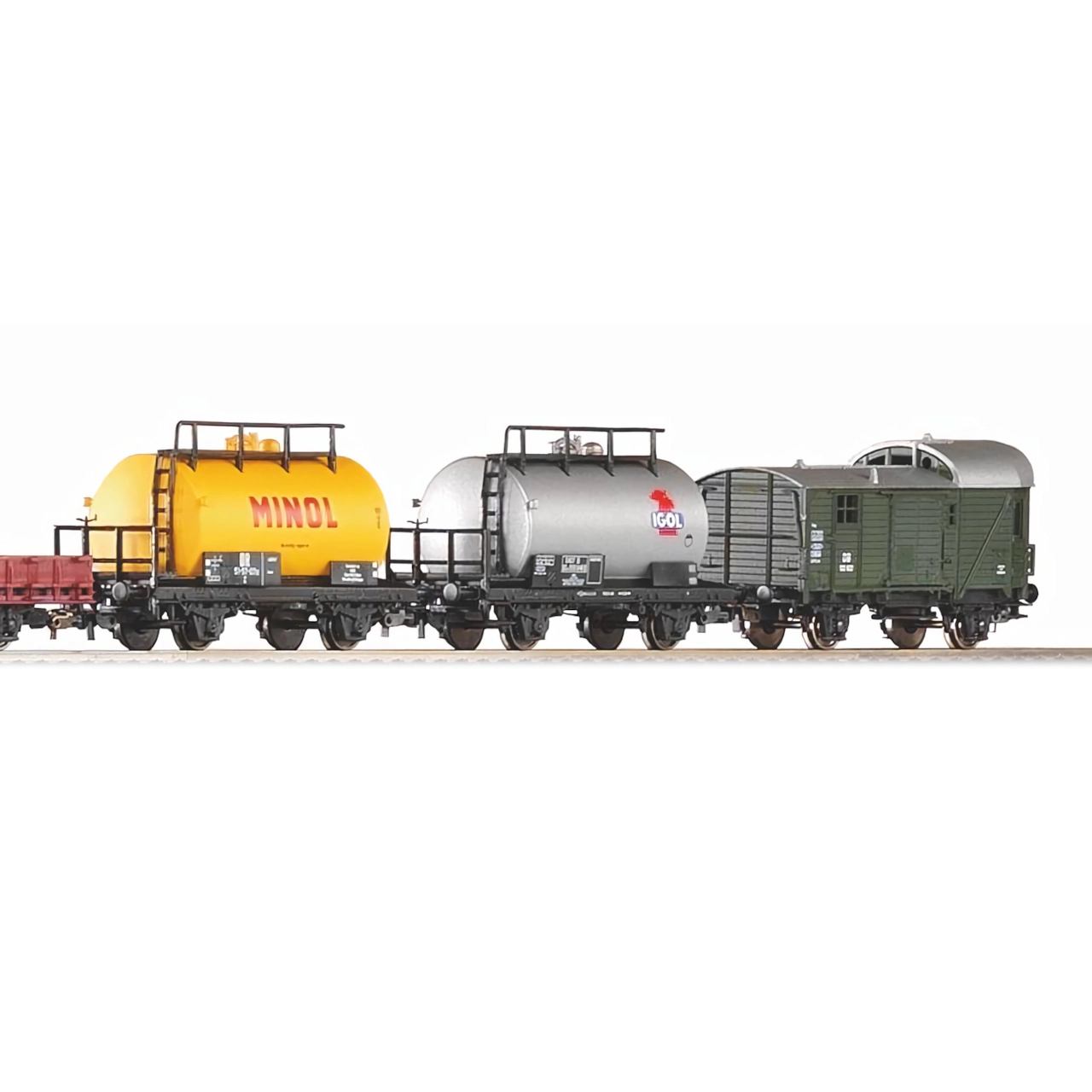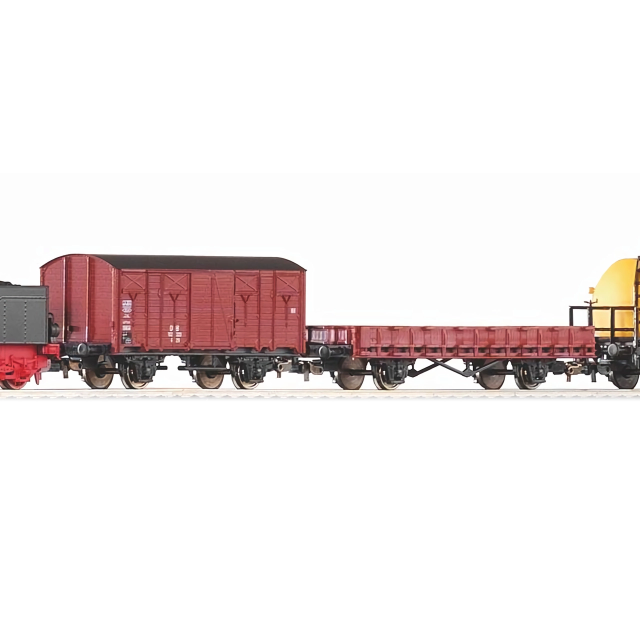 Skład obejmuje mieszankę wagonów towarowych DB epoki III – wagon kryty, platformę i cysterny – do zmiennych zestawień i realistycznych scenariuszy towarowych na Twojej trasie.