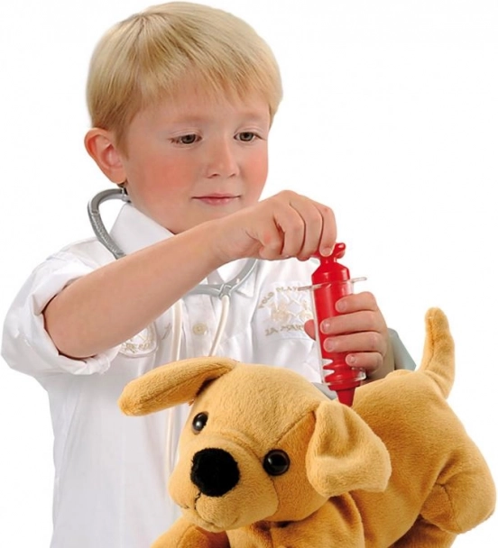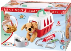 Walizeczka łatwo zamienia się w transporter dla pieska, a jednocześnie utrzymuje całe akcesoria w jednym miejscu. W zestawie znajduje się miska dla pieska, kość oraz podstawowe wyposażenie lekarskie do pomysłowej opieki nad pupilem.