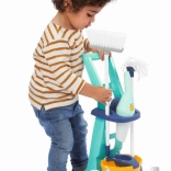 Wózek zawiera wszystkie niezbędne narzędzia do zabawy w sprzątanie, w tym miotłę, mop i ręczny odkurzacz.