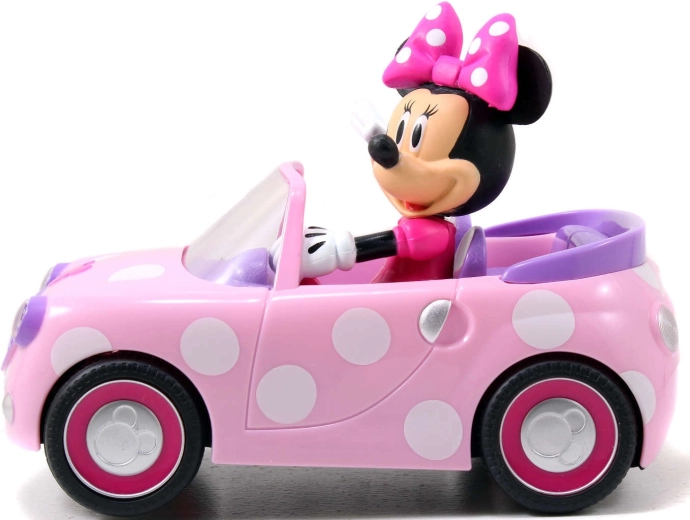 Różowy kabriolet w kropki z trwale zintegrowaną figurką MINNIE MOUSE wspiera wyobraźnię i zabawę tematyczną.