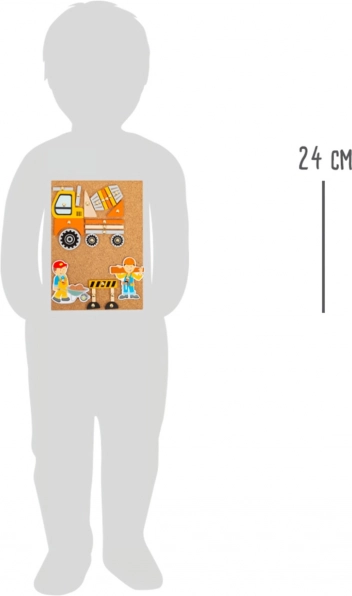 Korkowa tablica z pinezkami umożliwia wielokrotne układanie i przearanżowywanie scen transportowych i budowlanych zgodnie z wyobraźnią dzieci.