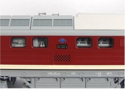 Wierny i detaliczny model lokomotywy spalinowo‑elektrycznej BR 132 „Ludmilla” w barwach DR. Wyróżnia się m.in. detalami odmiennymi od innych wariantów, takimi jak poręcze na czole, detale okien czołowych i bocznych oraz wykonanie dachu. Malowanie i nadruki, obejmujące wszystkie elementy dekoracyjne, są najwyższej jakości, zgodne z linią produktową Expert. Model wyposażono w wydajny silnik z kołami zamachowymi, a moment przenoszą diagonalnie rozmieszczone ogumowane koła na wewnętrznych osiach wózków; napędzane są jednak cztery osie. W połączeniu z długą, odlewaną z cynku ramą zapewnia to wyjątkowe własności jezdne. Białe/czerwone oświetlenie LED zmienia się w zależności od kierunku jazdy, oświetlona jest także kabina maszynisty. Model można rozbudować dedykowanym dekoderem cyfrowym z modułem dźwiękowym i głośnikiem. Dostępne są również wagony odpowiedniego typu i wykończenia. Główne cechy: sześć osi napędowych silnik z dwoma kołami zamachowymi para ogumowanych kół napędowych światła z przełączaniem barwy zależnie od kierunku jazdy oświetlenie wnętrza złącze PluX22 wg NEM 658 gniazdo wg NEM 362 z kinematyką krótkiego sprzęgu Dokumentacja: Broszura do modeli BR 132/BR 232 (DE) Ogólne informacje o BR 130 (DE, EN, F, NL) Test modelu w magazynie Miniaturbahnen 2/2018 (DE) Instrukcja obsługi i lista części zamiennych modelu nr 52760 (DE, EN, F, NL)