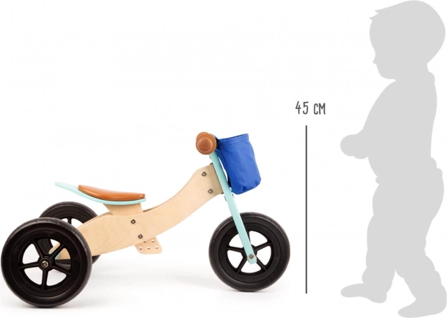 Stylowy i bezpieczny drewniany rowerek biegowy dla dzieci, który rośnie razem z nimi. Oferuje możliwość przekształcenia z trójkołowego na dwukołowy, wspiera rozwój umiejętności motorycznych i koordynacji.