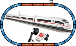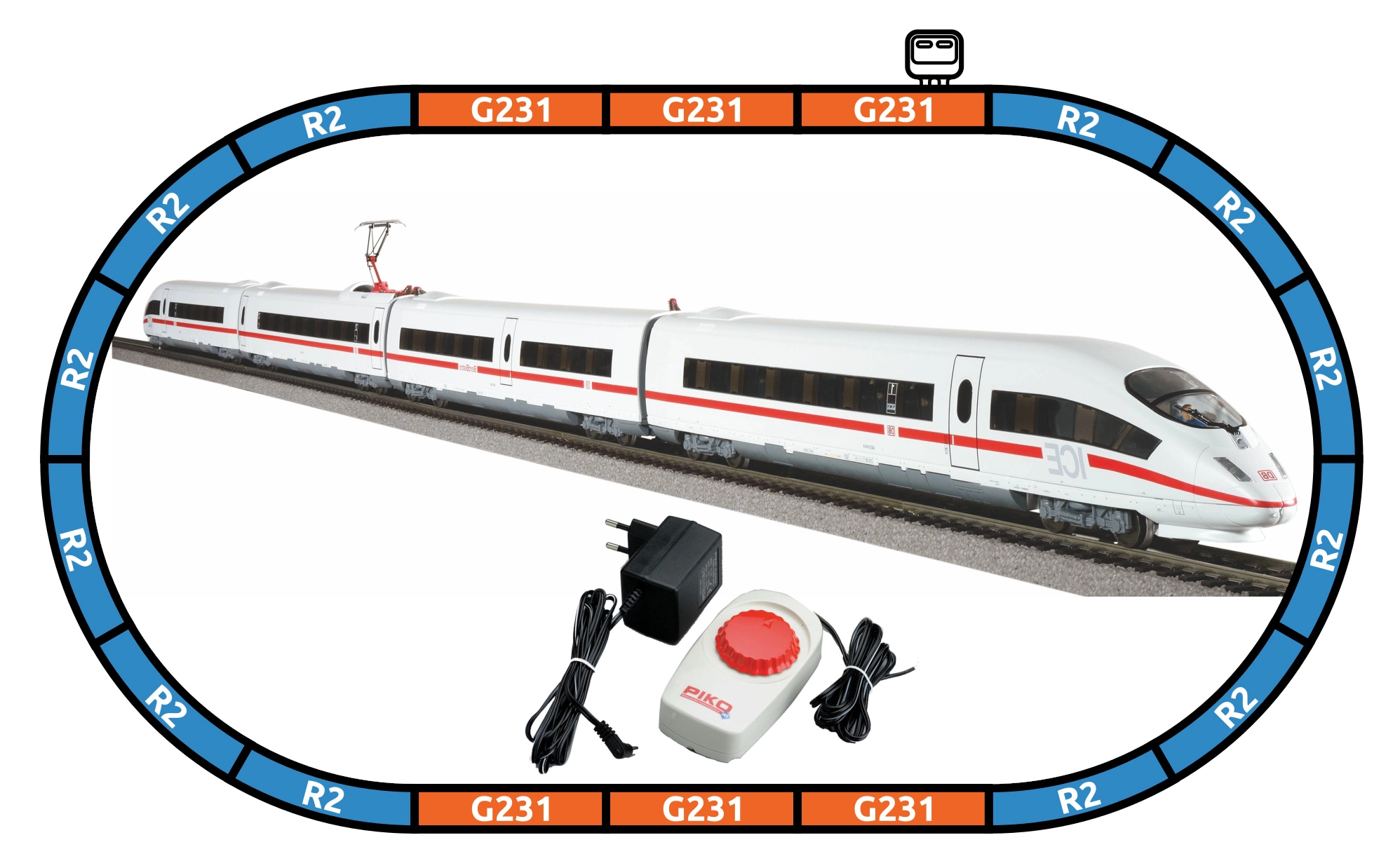 - 4-członowy skład ICE 3 DB AG (1 szt.), tory łukowe R2 z podsypką 55412 (12 szt.), proste G231 z podsypką 55401 (5 szt.), prosta G231 z zasilaniem 55406 (1 szt.), podkład pod zacisk 55447 (1 szt.), zacisk zasilający 55270 (1 szt.), analogowy sterownik z zasilaczem 55003 (1 szt.)