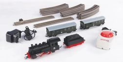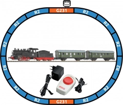 - Parowóz BR 98 z tendrem (1 szt.), wagon osobowy 2. klasy DB III (2 szt.), tory: łukowe R2 z podsypką 55412 (12 szt.), proste G231 55401 (1 szt.), proste G231 z przyłączem 55406 (1 szt.), podkład pod zacisk zasilający 55447 (1 szt.), zacisk zasilający 55270 (1 szt.), analogowy sterownik z zasilaczem 55003 (1 szt.)