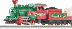 Lokomotywa parowa 0-4-0 z tendrem, wagon osobowy i dwa wagony towarowe w spójnym, świątecznym wzornictwie. Idealne do natychmiastowego stworzenia atmosfery.