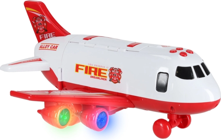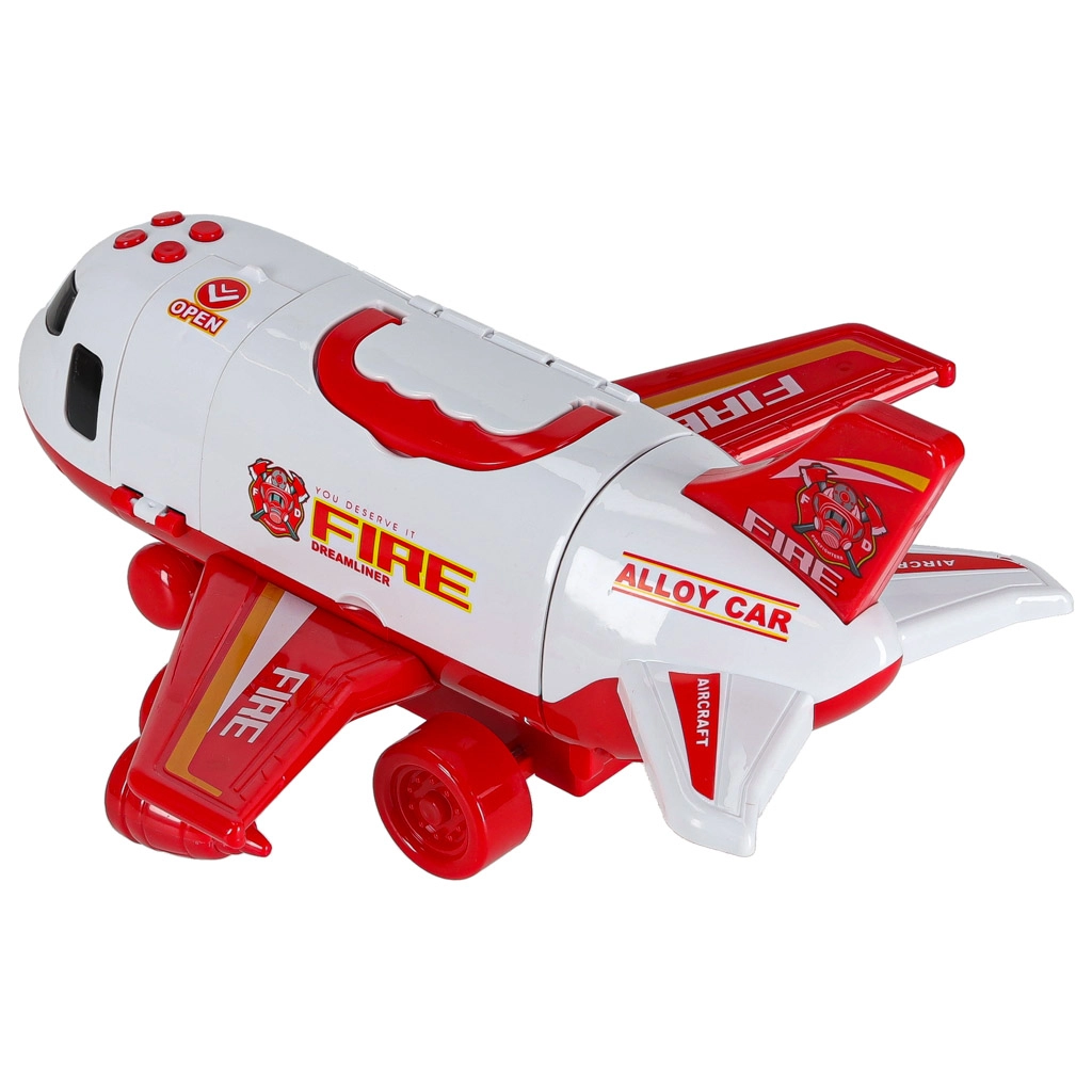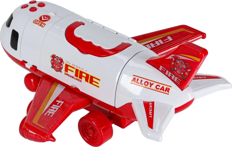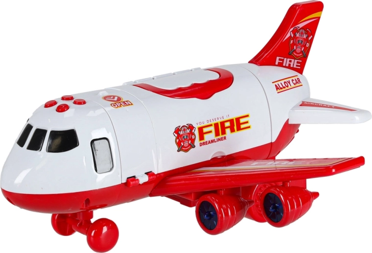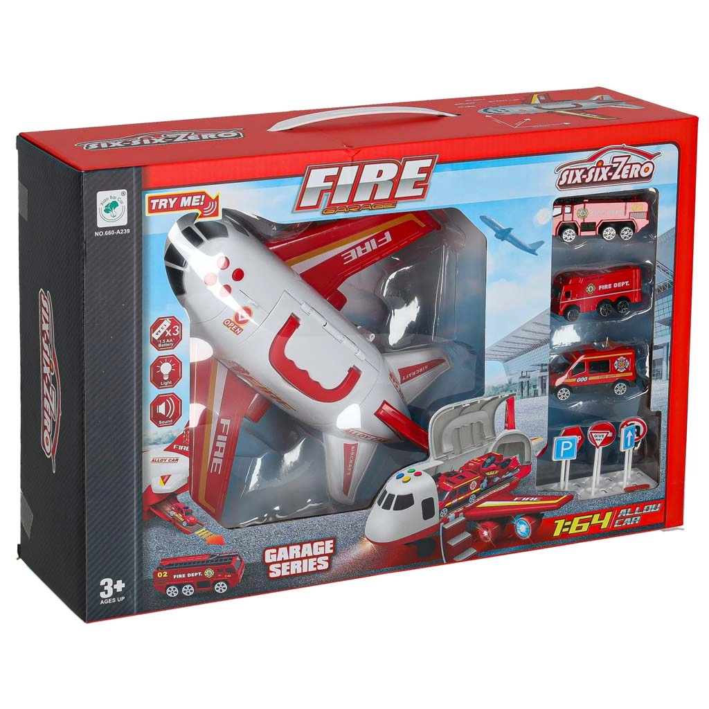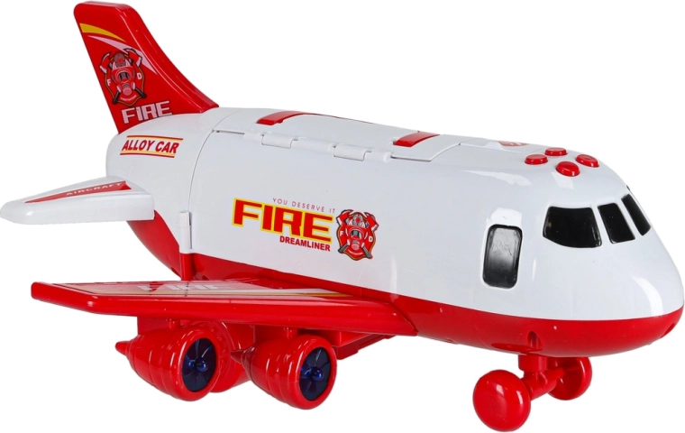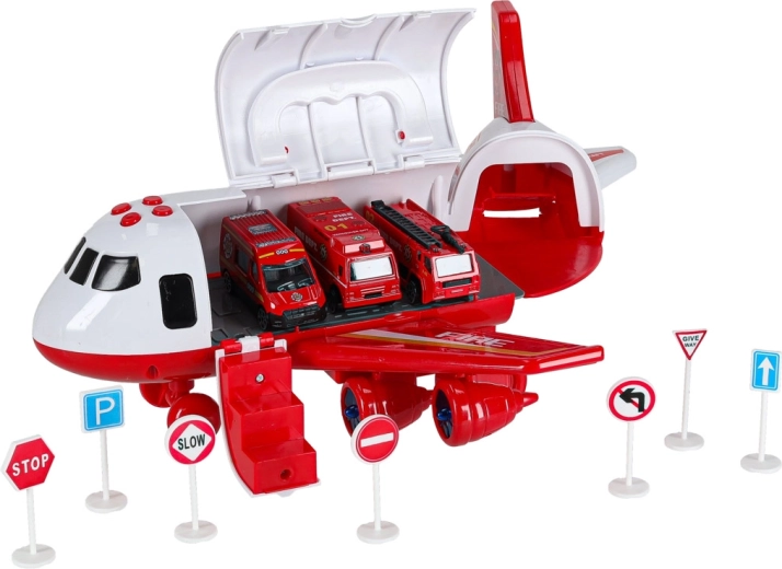 W komplecie są 3 wozy strażackie oraz zestaw 7 znaków drogowych. Wszystko mieści się wewnątrz samolotu, więc masz porządek i gotowość do drogi.