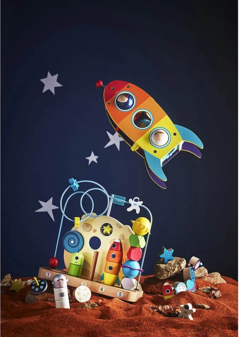 Odkrywaj tajemnice kosmosu z tą wspaniałą drewnianą przeplataną zabawką. Małe rączki będą się świetnie bawić nawlekając korale na tekstylną sznurówkę, co pomaga w rozwijaniu motoryki małej oraz koordynacji ręka-oko.