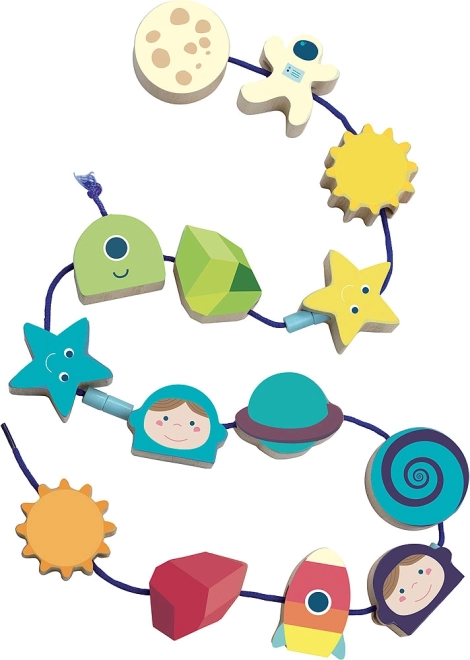Piękna kosmiczna przeplatanka, świetna do rozwijania motoryki małej u dzieci. Zawiera 14 pięknie ilustrowanych drewnianych korali takich jak astronauta, księżyc, słońce i rakieta.