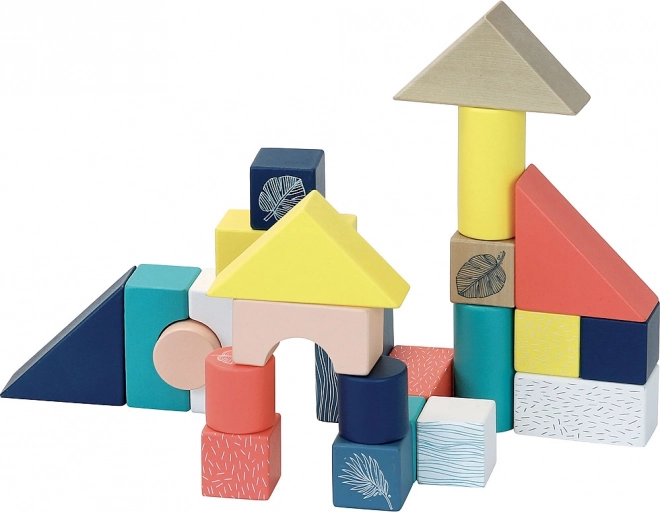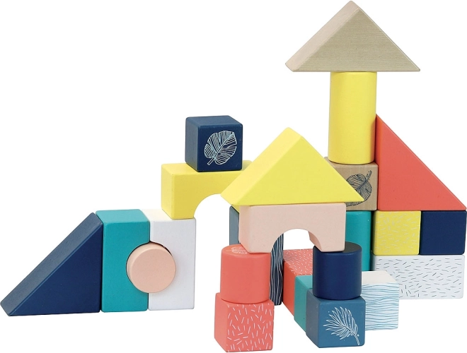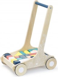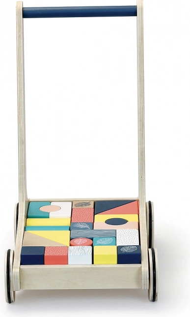 24 klocki o różnych kształtach znajdują się w wózku, co daje dzieciom niezliczone możliwości twórczej zabawy. Wózek ma nowoczesny design z niebieską rączką i białymi ilustracjami.