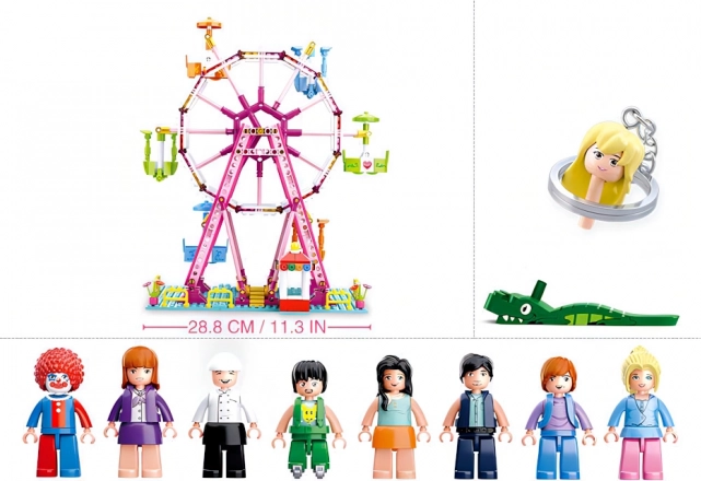Dominantą zestawu jest duży różowo-niebieski diabelski młyn z działającą rotacją i wieloma gondolami. Dzieci z łatwością rozkręcą atrakcję i stworzą realistyczną atmosferę wesołego miasteczka.