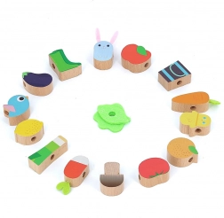 Zestaw 14 ilustrowanych koralików (np. bakłażan, pomidor, ptaszek, kalosze) pobudza wyobraźnię, uczy kolorów i nazywania.