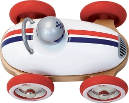 Podaruj dzieciom klasyczną zabawkę z ponadczasowym urokiem. Drewniany Roadster marki VILAC łączy wysokiej jakości lakierowane drewno i metal z gumowanymi kołami, dzięki czemu jazda jest cicha i płynna zarówno na podłodze, jak i na dywanie. Eleganckie białe nadwozie z niebiesko-czerwonymi paskami oraz stylowa figurka kierowcy podkreślają autentyczny, wyścigowy wygląd.