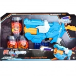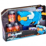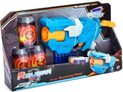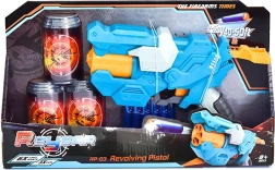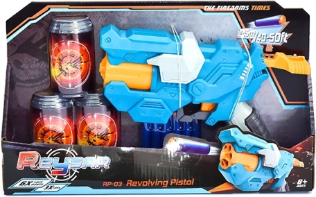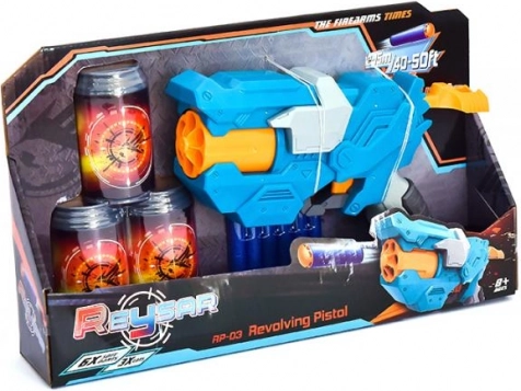W zestawie znajdują się trzy plastikowe puszki, które służą jako tarcze do treningu celowania, oraz sześć miękkich piankowych nabojów do bezpiecznej zabawy. To doskonały wybór do domowych konkursów celności i dynamicznych pojedynków z towarzyszami zabawy.