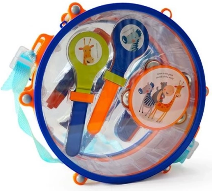 W komplecie znajduje się bębenek z pałeczkami, tamburyn, marakasy, flet i inne grzechotki – wszystko w żywych kolorach dla radosnej nauki.
