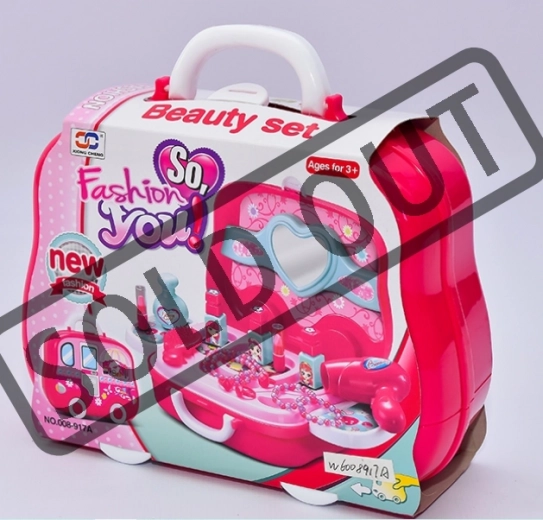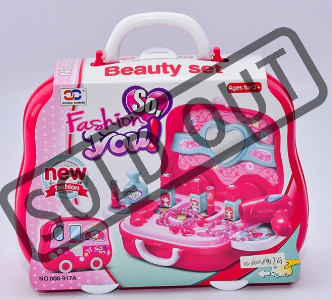 W skład zestawu wchodzi lusterko, pomadki, lakiery do paznokci, perfumy, suszarqa do włosów, grzebień, bransoletki i pierścionki – wszystko wykonane z lekkiego plastiku bezpiecznego dla dzieci. Wyposażenie zaprojektowano tak, aby było łatwe do chwytania nawet dla małych rączek i wspierało małą motorykę oraz kreatywną zabawę.