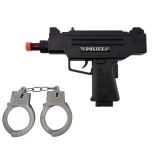 Zabawny zestaw policyjnego wyposażenia dla dzieci, zawierający policyjny pistolet i kajdanki. Idealny do zabawy w policjanta, rozwijania wyobraźni i odgrywania ról w domu i na zewnątrz.