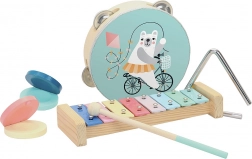 Komplet zawiera wszystko, co potrzebne do małej domowej orkiestry: kolorowy ksylofon z pałeczką, tamburyn z misiem, jasno brzmiący trójkąt oraz parę wygodnych kastanietów. Dzięki ergonomicznemu wykonaniu instrumenty dobrze leżą w małych dłoniach i motywują dzieci do muzycznej zabawy.