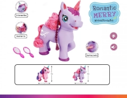 Uroczy fioletowy jednorożec na baterie ucieszy dzieci swoimi efektami – po naciśnięciu przycisku na brzuszku zacznie śpiewać angielską piosenkę, wydaje magiczne dźwięki, a jego róg świeci. W zestawie znajdują się grzebyk i lusterko do czesania długiej grzywy.