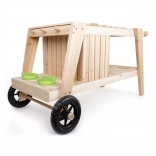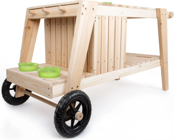 Łatwe przemieszczanie zapewniają duże kółka, co umożliwia ruch także po nierównym terenie. Funkcjonalność uzupełniają metalowe elementy, takie jak miski i doniczki, które dodatkowo rozszerzają możliwości zabawy – od pieczenia po ogrodnictwo.