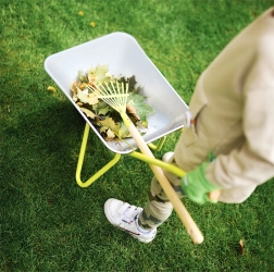 Zestaw zawiera łopatę, grabie i bawełniane rękawice, co czyni z niego idealny pakiet dla małych pomocników ogrodowych.