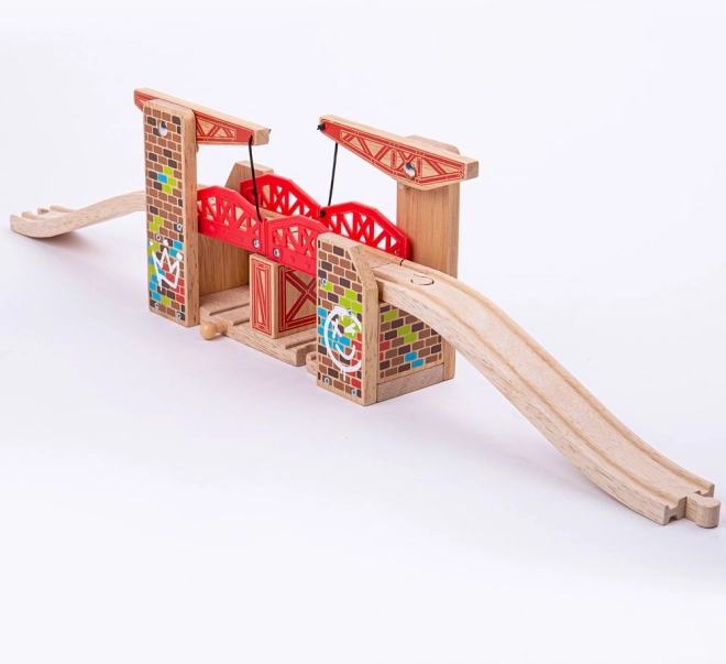 Podwójny most podnoszony od Bigjigs Rail pozwala łatwo podnieść obie strony, zapewniając wystarczająco dużo miejsca na równoczesny przejazd dwóch pociągów. Ten most jest kompatybilny z większością innych marek drewnianych kolei.