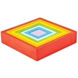 Tęczowa paleta i stopniowo zmniejszające się kwadraty uczą dzieci rozróżniania kolorów, rozmiarów i kształtów. Idealne do pierwszego sortowania i nazywania.